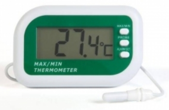 A hőmérő egyidejűleg két (pl. terem- és hűtő-) hőmérsékletet mér a beépített- és kivezetett érzékelőjével. Mindkét értékre külön számol Max és Min értéket, a 6 érték közül egyidejűleg egyet jelenít meg (a többit nyomógombokkal lehet előhívni). A Max/Min értékek a MAX/MIN gomb tartós (3 másodperc) megnyomásával törölhetők. A készülék riasztási funkcióval rendelkezik, így hangjelzést ad, ha a terem vagy a hűtő hőmérséklete a beállított értékeket túllépte. Műanyag fali tartó mellékelve.