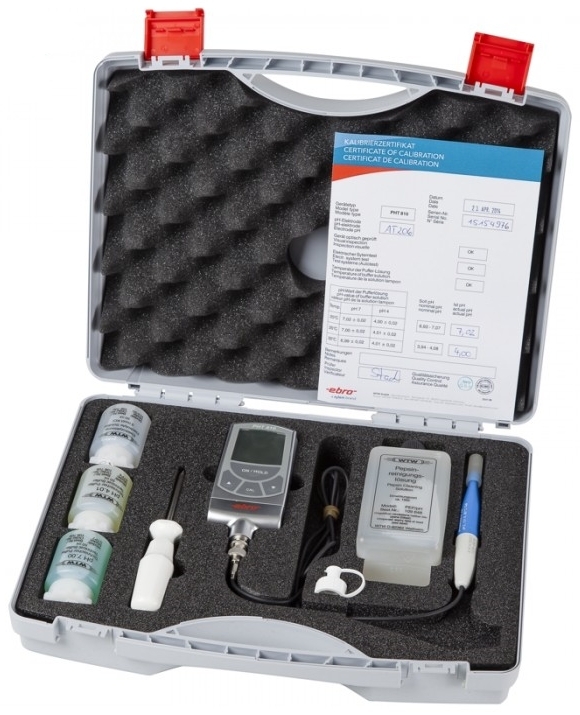 A szett tartalma: PHT 810 mérőműszer, AT 206 üveg mérőelektróda, pH4 és pH7 pufferoldatok, fehérje tisztító oldat, KCl oldat, előszúró szerszám, műanyag hordtáskában.