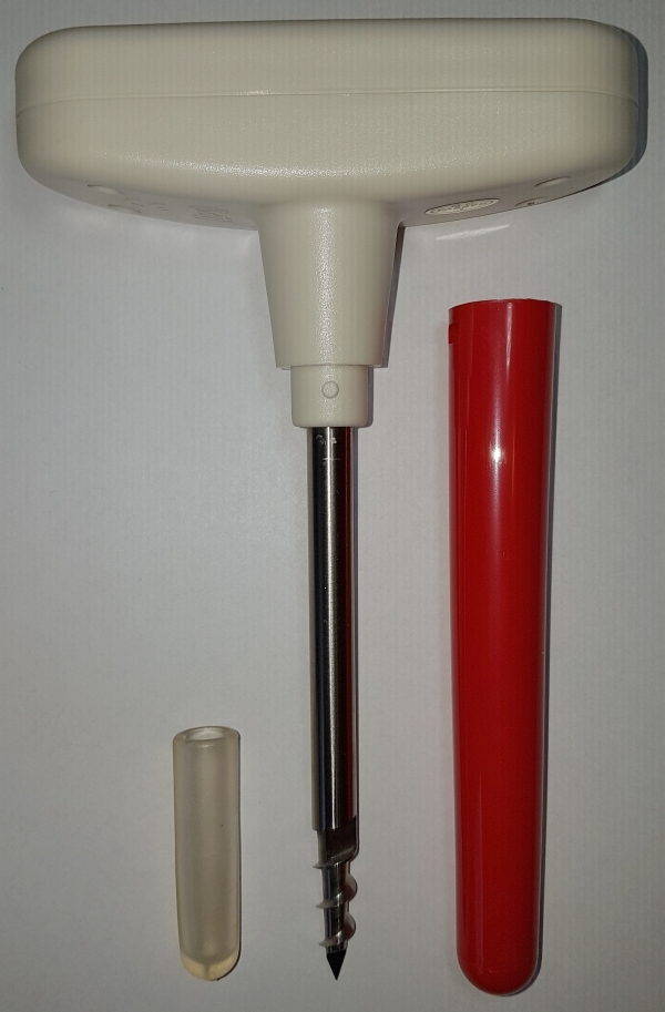 A "T" alakú hőmérő megerősített fejrésszel, 100 mm hosszú, 8 mm átmérőjű rozsdamentes, menetes végű érzékelővel van ellátva.