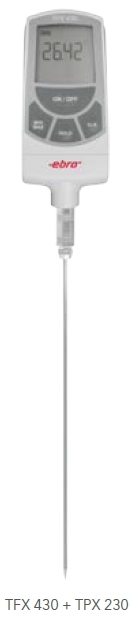 A TFX 430 digitális hőmérő + TPX 230 rozsdamentes, szúró érzékelővel szerelt készülék, 4 pontos gyári ISO kalibrálási bizonyítvánnyal (-20°C, 0°C, +120°C és +250°C.)