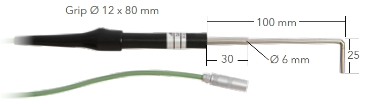 | Érzékelő | átmérő: 4,2 mm (6 mm szár), poliamid filmmel bevont hőelem; érzékelő szára 90°-os szögben meghajlított, szár hossza: 100 mm; markolat: átmérője: 12 mm, hossza: 80 mm; válaszidő: 2 sec (t99) |