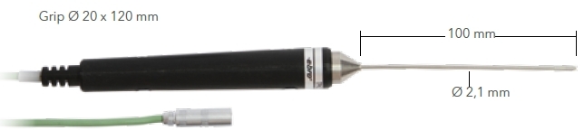 | Érzékelő | átmérője: 2,1 mm, hossza: 100 mm; hegyes végű; válaszidő: 2,5 sec (t99) |